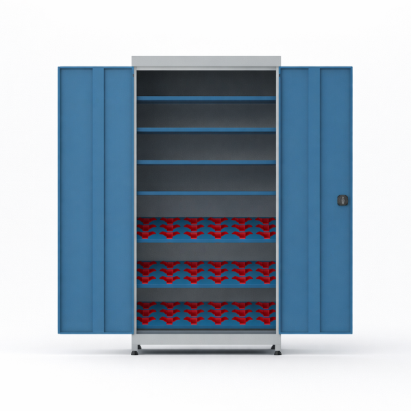 Cnc Dolabı 4 Adet Taşma Raflı 3 adet 54 Cnc Tutuculu Endüstriyel Malzeme Dolabı, ağır hizmet ortamlarında sorunsuz şekilde kullanılabilecek şekilde tasarlanmıştır. Gövde yapısı komple kaynaklı olup sağlam ve dayanıklıdır. Tüm aksamlar, güçlendirilmiş metal iskelet üzerine sabitlenmiştir. Kapaklar kilitlenebilir özelliktedir