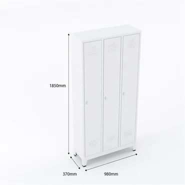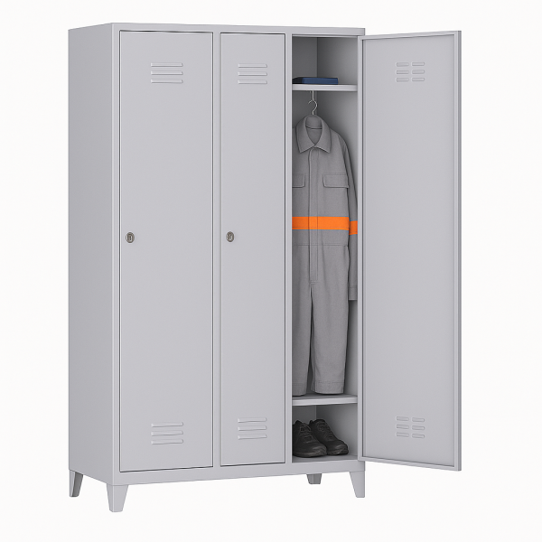 Üçlü çelik soyunma dolabı, personel kullanım alanları, spor tesisleri, okul ve endüstriyel ortamlar için dayanıklılık ve uzun ömür hedeflenerek üretilmiştir. Çelik gövde yapısı ve havalandırmalı kapak tasarımı sayesinde günlük yoğun kullanıma uygundur.